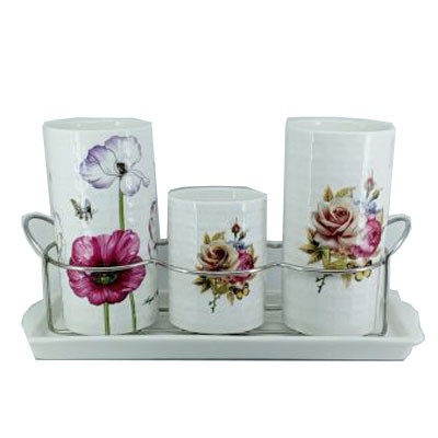 Cutlery Spoon Holder Ceramic with Tray 3Pcs Set with Stand 1Pc Colour - Angel Flower